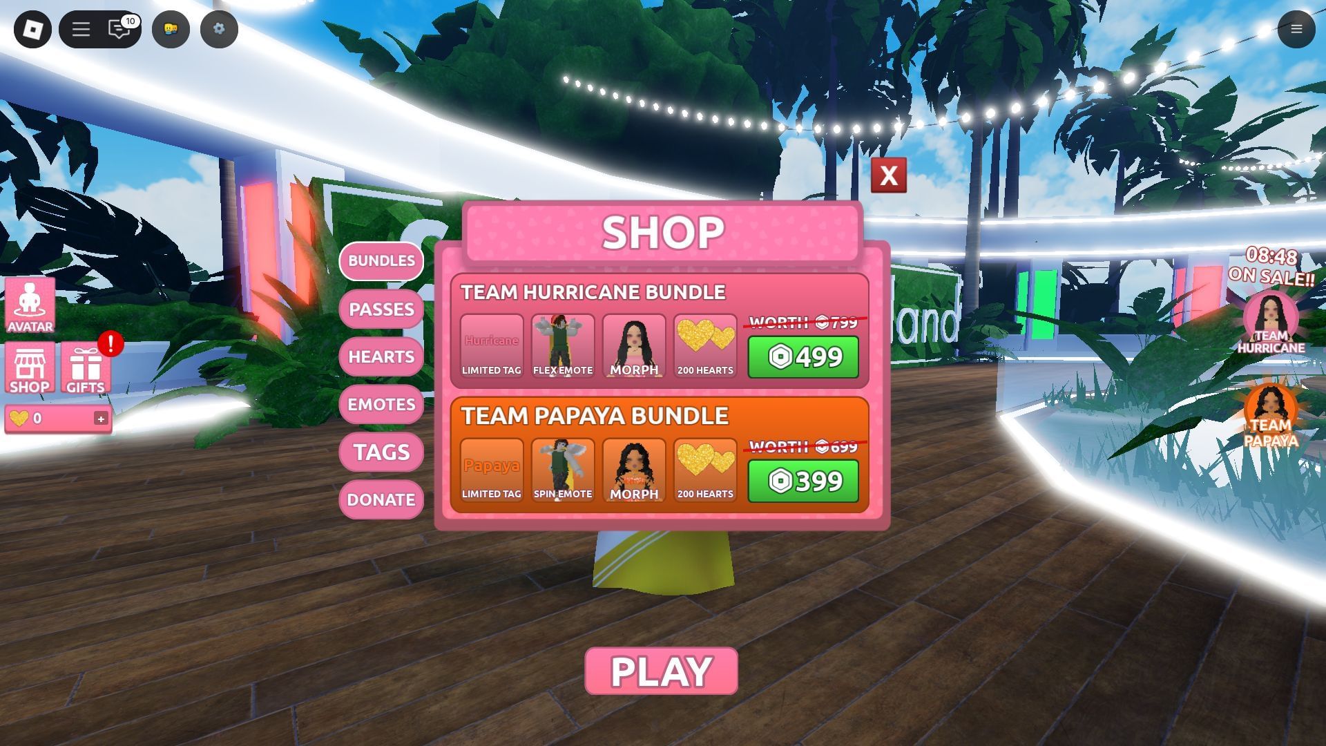 - Shop: Here, you can buy various in-game items. These items are mostly of a cosmetic nature and don’t impact how well you develop friendships with other players. Items like Emotes can be purchased with Hearts, while game passes and bundles are exclusively premium.