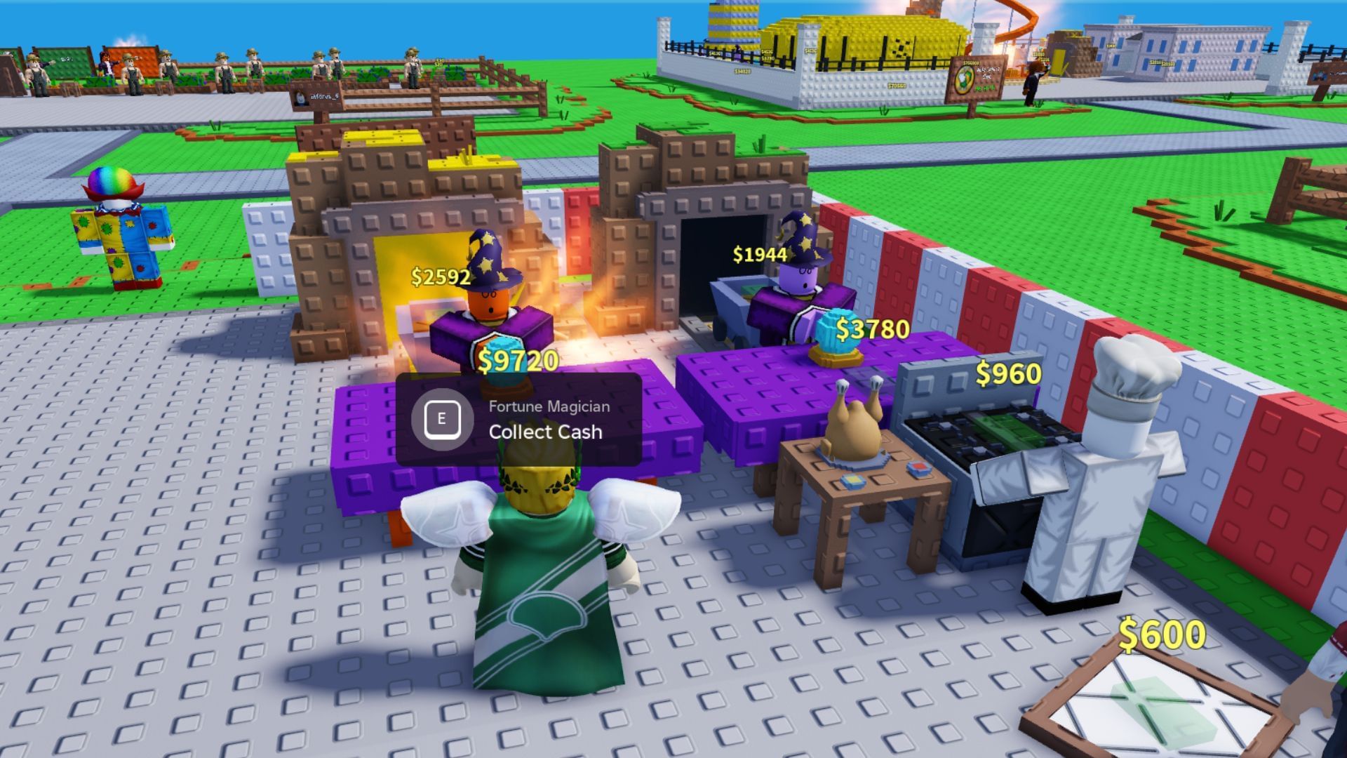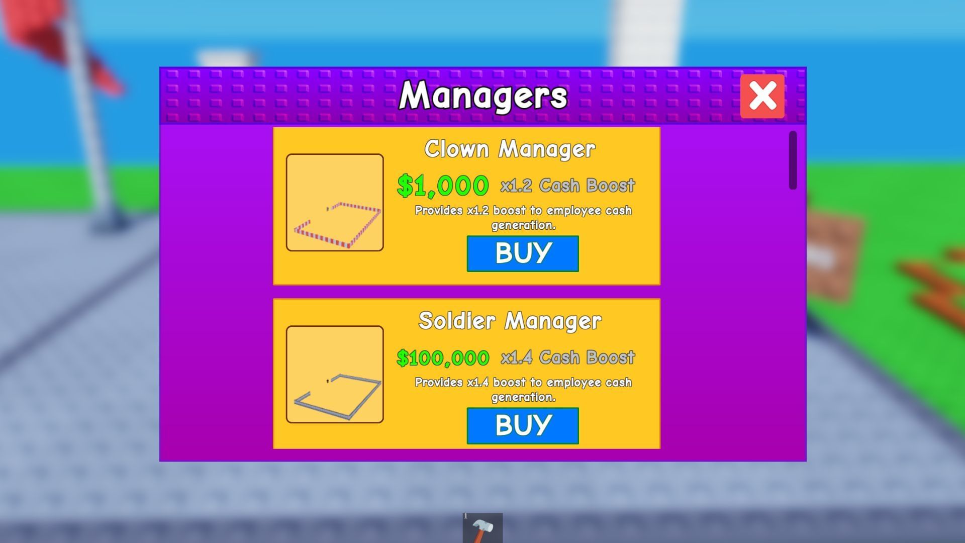 Once you set up a couple of things on your land, you must also get a Manager. You can purchase one from the stand right beside the Shop. Note that Managers offer a cash boost to your existing employees, allowing you to make more money than usual. You can purchase the Clown Manager as a beginner since others cost a lot of money. The Clown Manager offers a 1.2x cash boost, which is quite decent.