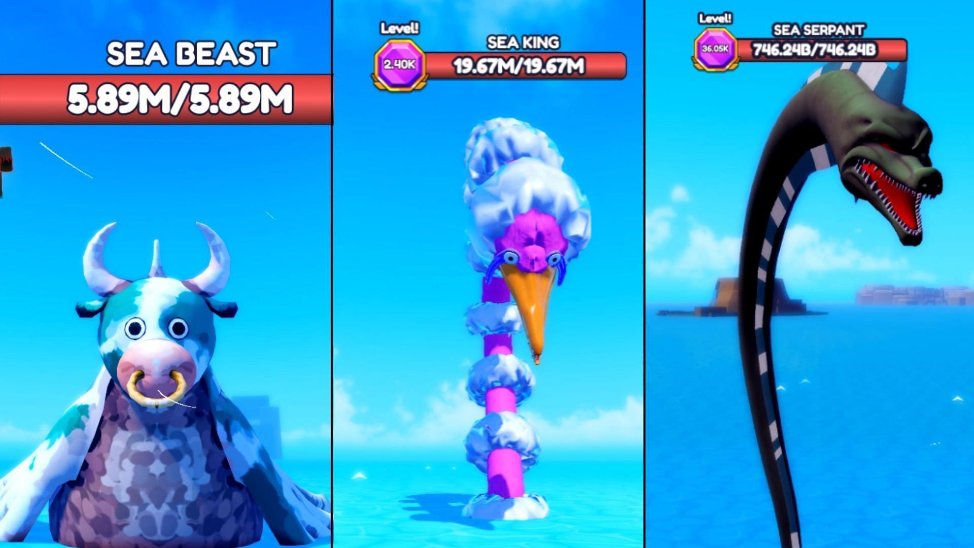 There are three types of Sea Beasts in One Fruit Simulator - Sea Cow, Sea King, and Sea Serpent.