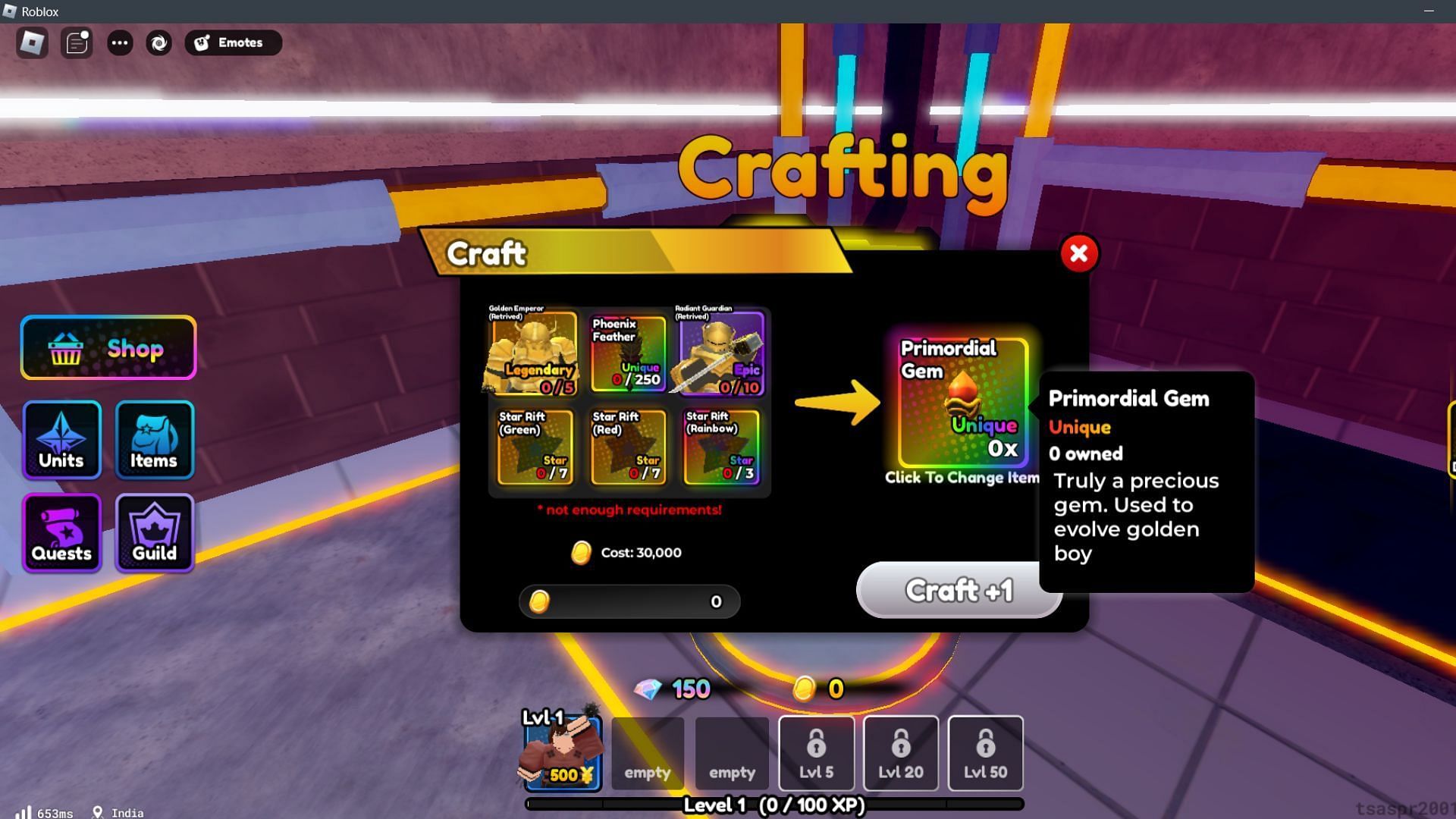 Like all units, you will need only the evolution item, Primordial Gem, to transform the Golden Boy. To craft this material on the crafting station, the following items are required: