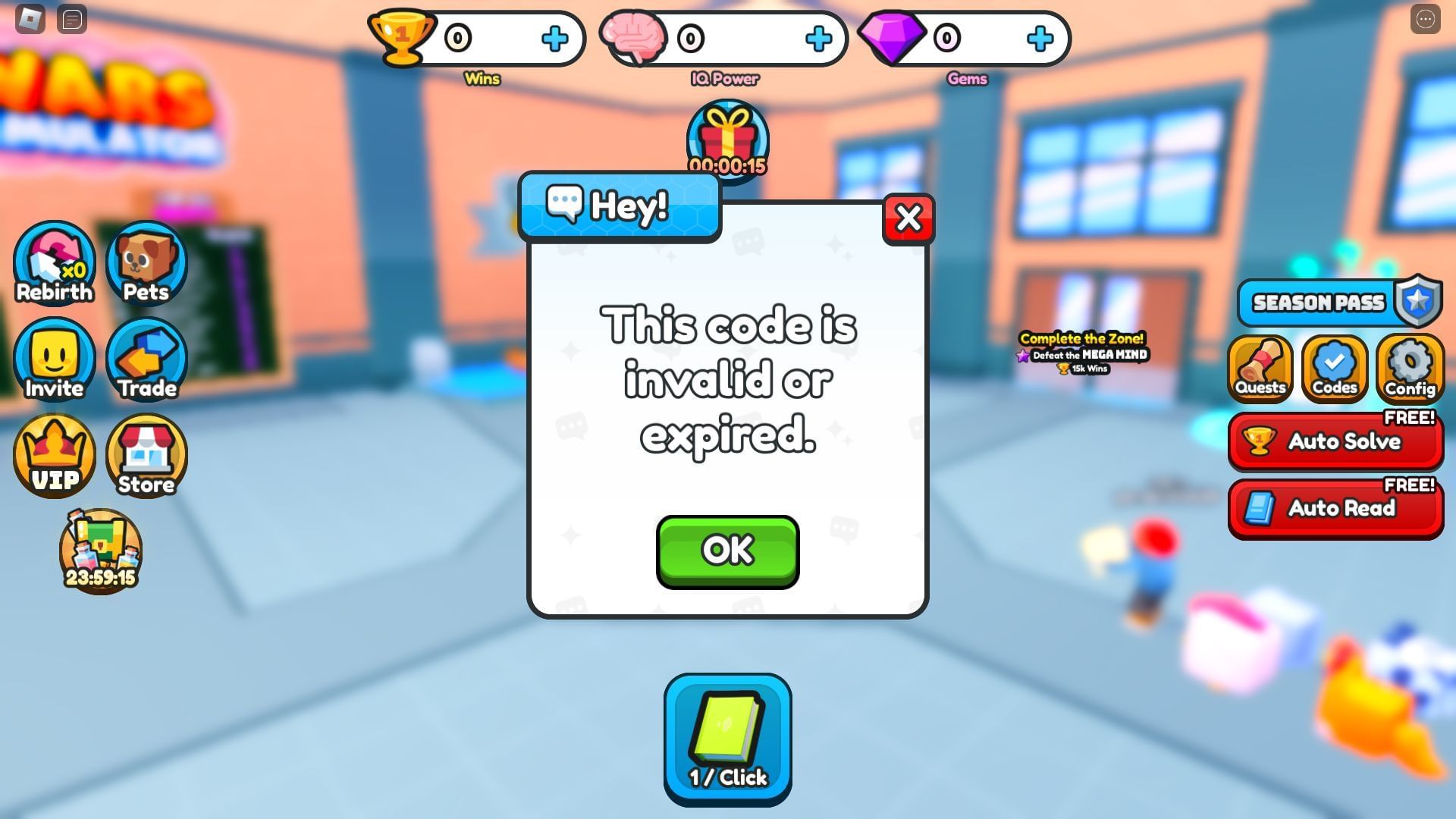 IQ Wars Simulator will show an error message when an inactive or incorrect code is entered. Currently, there are no server-related issues in the game that affect its code system. Should you encounter them while accessing the code system, reboot the Roblox game client to resolve it.