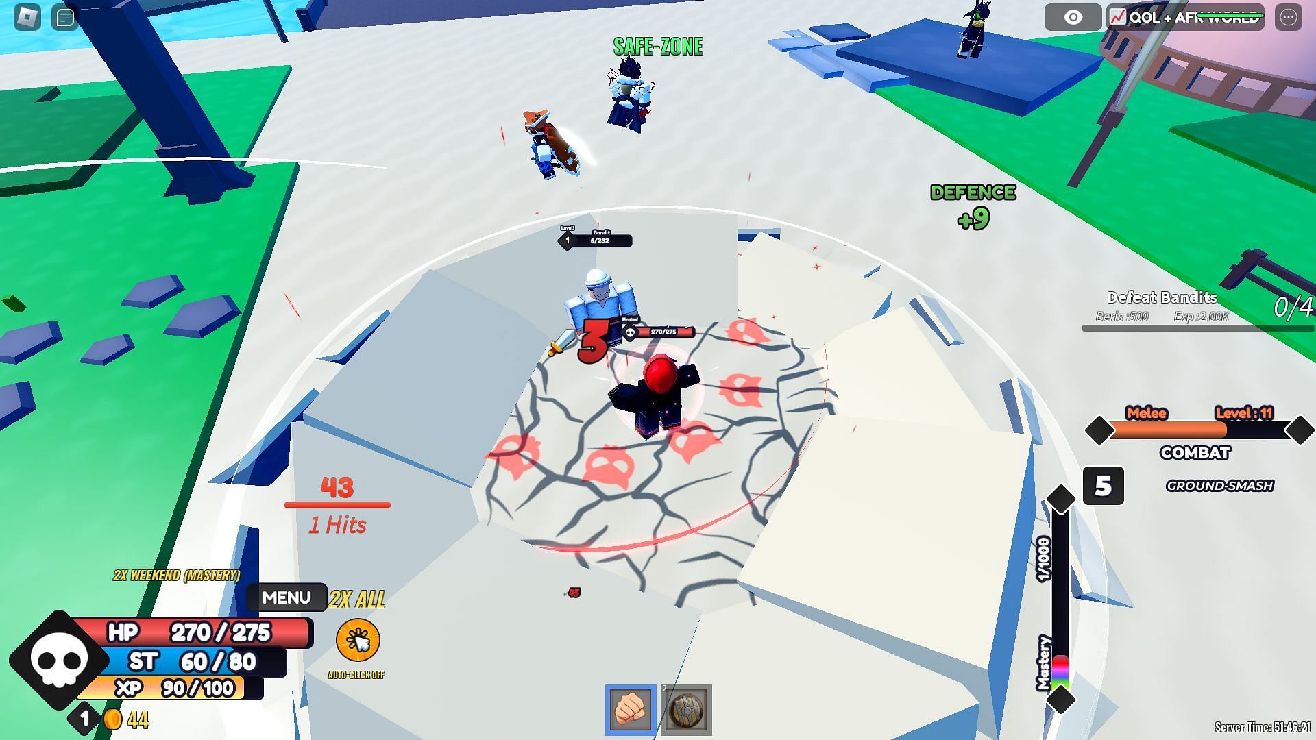 Each fighting style comes with a suite of skills with varying effectiveness. They can buff the user, hit single enemies, or have an area of effect to simultaneously strike multiple enemies. These skills can be unlocked by gaining Mastery, which can be collected by repeatedly using the fighting style to kill enemies.
