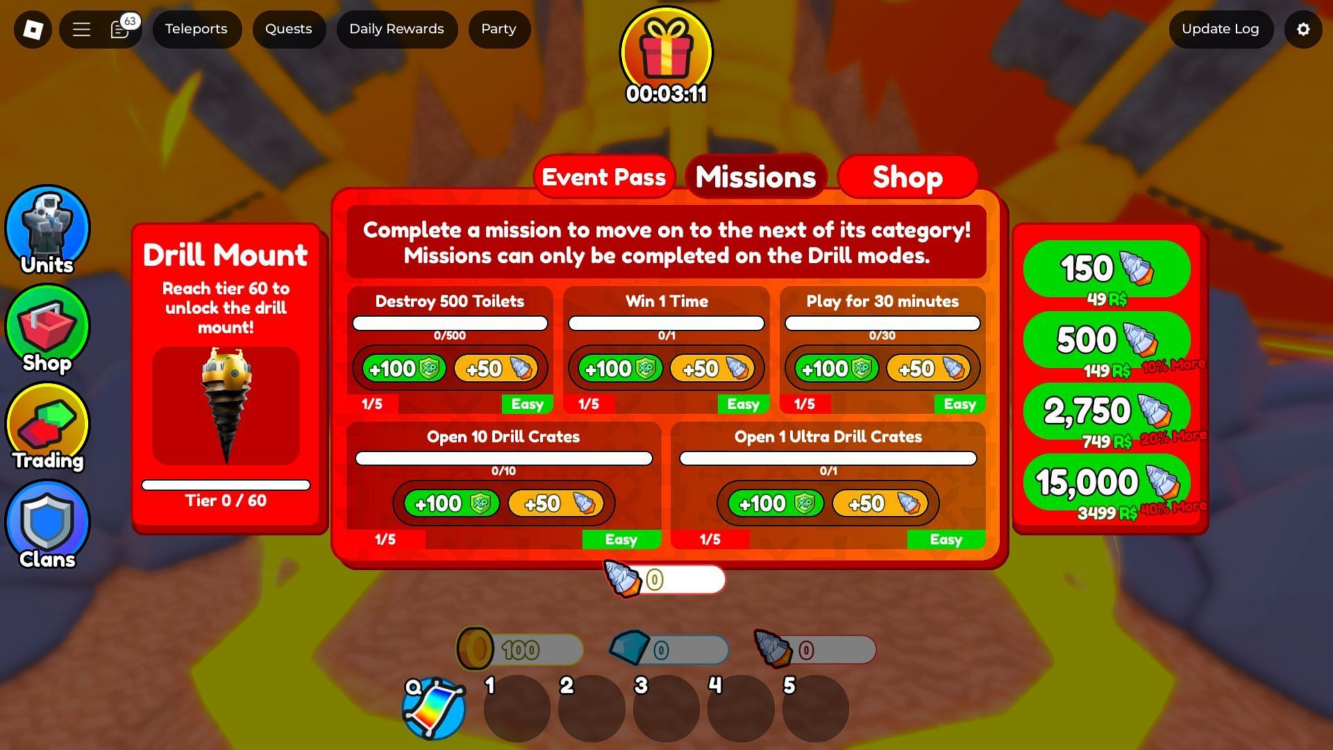 The missions can be accessed by clicking the Missions tab next to the Event Pass. You must teleport to the Drill Event from the main spawn area. Walk into the Drill Event arena where the game will ask if you wish to be teleported to the new arena. Simply click yes to proceed.