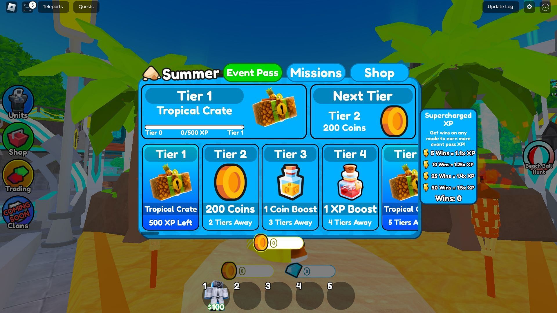 The Summer Event Pass is a free battle pass featuring 60 levels that rewards you per level up. This battle pass rewards you with Coins, Gems, XP Boosters, exclusive units, and more, making it a great way to accrue resources without spending Robux.
