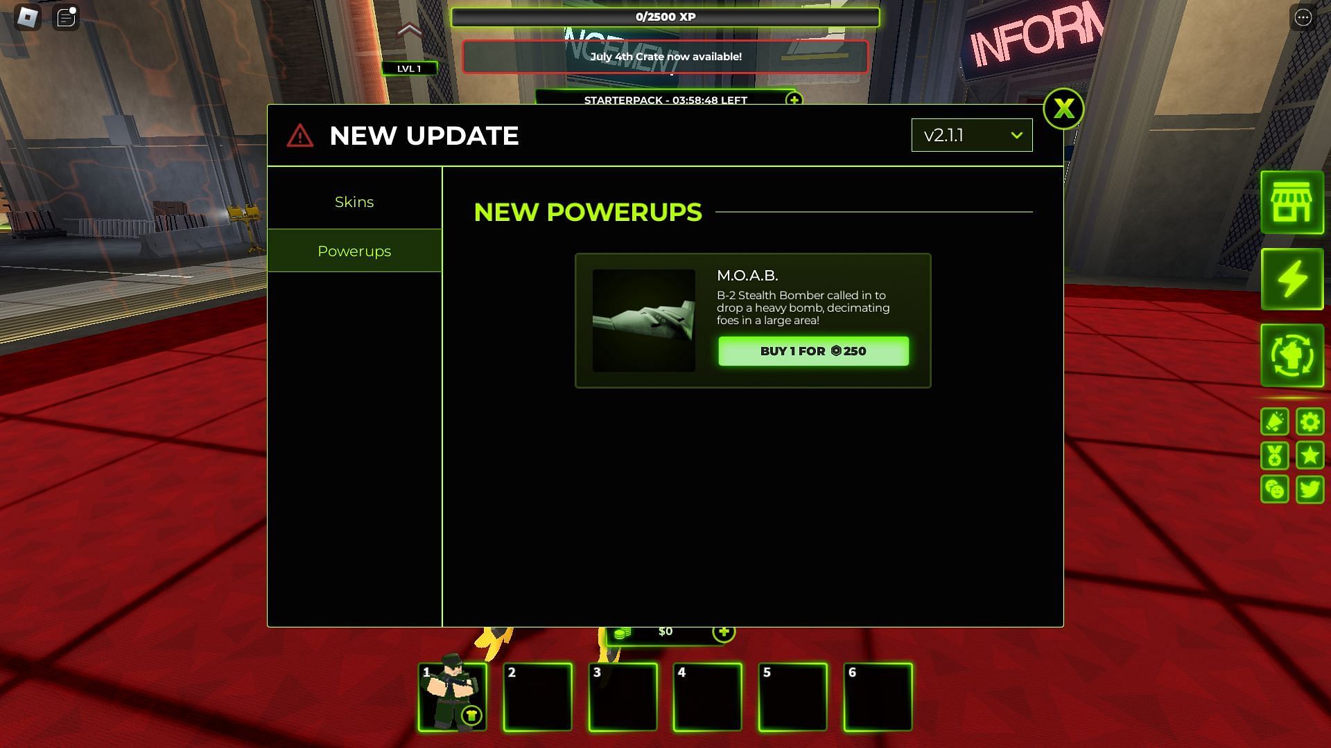 The M.O.A.B power-up costs 250 Robux and can only be used once per purchase.