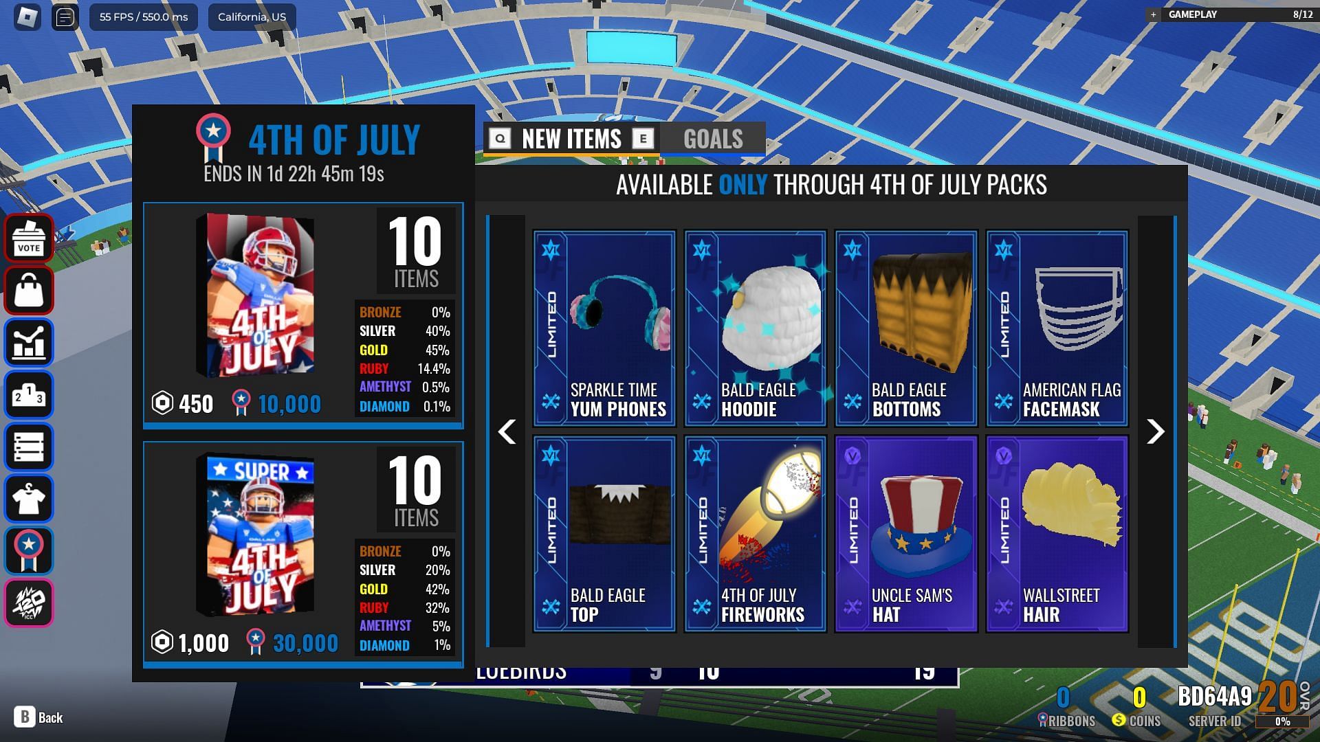 Ultimate Footballers can open the 4th of July item pack using 10,000 Ribbons or 450 Robux to receive 10 items from the pool. Here’s a breakdown of the item rates: