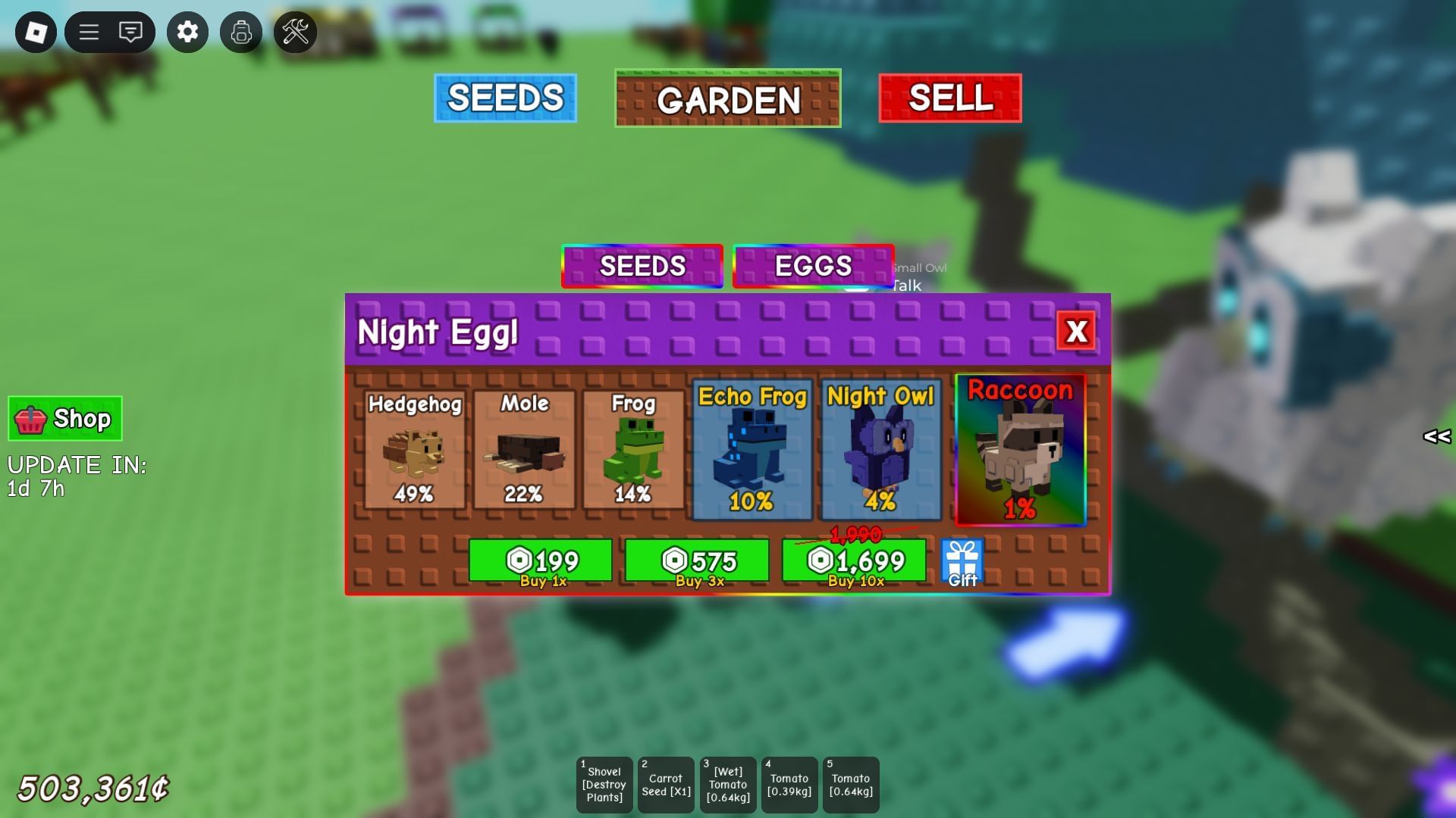 You may also buy Night Eggs at the Twilight Shop and the Blood Moon Shop for 50 million Sheckles and 25 million Sheckles, respectively. Alternatively, Night Egg Packs are available in bundles of one, three, and 10 Eggs for 199, 575, and 1,699 Robux, respectively.