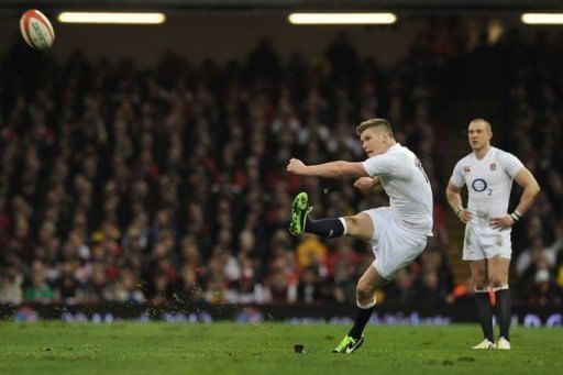 England’s Owen Farrell kicks a penalty during the Six Nations match against Wales in Cardiff, March 16, 2013. Wales won 30-3.