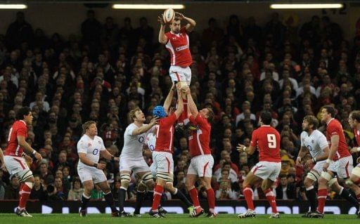 Wales’s flanker Sam Warburton takes the ball during a line-out in the match against England in Cardiff, south Wales on March 16, 2013. Wales won 30-3.