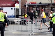 Members of the bomb squad investigate a suspicious item on the road as runners pass by after two bombs exploded during the 117th Boston Marathon on April 15, 2013 in Boston, Massachusetts. (Getty Images)