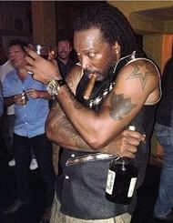 Chris Gayle seen busting a move while attempting to coherently indicate his desire for another bottle.