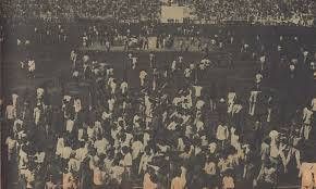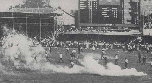 That was the trigger for a massive sea of people making their way onto the field and engaging in a battle with the policemen, who were badly outnumbered, and a riot ensued. The crowd uprooted bamboo poles from the makeshift stand and set the canvas roof on fire.