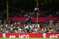 Spidercam was seen skewed after it hit the outfield during the International Twenty20 match between Australia and India at Sydney Cricket Ground today in Sydney, Australia.