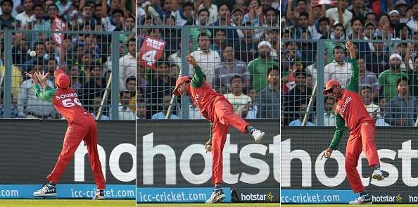 Hafeez thought he had connected well enough with a slog sweep to clear the boundary at cow corner, but Sarkar leaped up high to grab hold of the ball very close to the boundary line. He then made sure that he threw the ball in the air while maintaining his balance, before coming back into the field of play and completing what was a terrific catch.