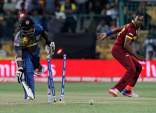 After bowling a wide on the first ball, Bravo bowled a slow looping full toss which Mathews completely failed to read. He tried to duck but only ended up top-edging the ball, which went straight into the hands of wicketkeeper Denesh Ramdin.