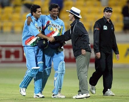 So after six straight losses, India went into the 5th ODI looking to set things right. They started well, with Zaheer Khan picking up Nathan Astle and Mathew Sinclair off successive deliveries. In his second over, he accounted for Chris Harris, leaving New Zealand reeling at 3-3. The Kiwis never really recovered from that despite decent scores from the middle order, and finally huffed their way to 168, courtesy 20 extras. It wasn’t a particularly threatening target, but India managed to lose their heads anyway.