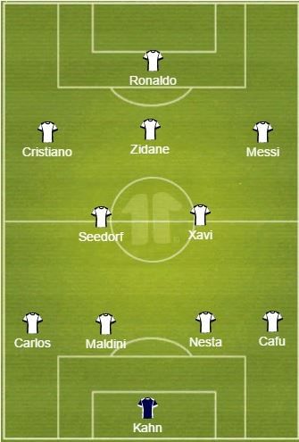 Substitutes: Iker Casillas, John Terry, Andrea Pirlo, Andres Iniesta, Luis Figo, Ronaldinho, Thierry Henry