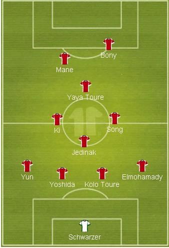 Substitutes: Brad Jones (GK, Liverpool, Australia), Armand Traore (LB, QPR, Senegal), Victor Wanyama (DM, Southampton, Kenya), Mo Diame (CM, Hull City, Senegal), Yannick Bolasie (LW, Crystal Palace, Congo), Riyad Mahrez (RW, Leicester City, Algeria), Diafra Sakho (CF, West Ham United, Senegal), Didier Drogba (CF, Chelsea, Ivory Coast)