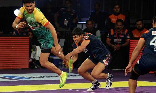 Pardeep Narwal(L) in action against Bengal Warriors