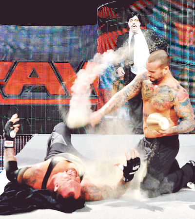 The ref was then accidently knocked down. Punk delivered a signature running knee but Taker countered into a set up for the Last Ride. In a desperate attempt, Heyman quickly handed the urn to Punk who used it strike Taker. Punk went for the cover just as the ref came too but Taker still kicked out.