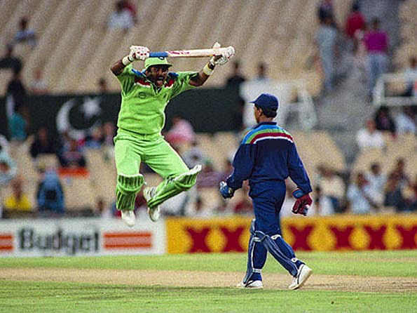 But, Miandad ensured that his name was inextricably entwined with the history of the encounter. After Kiran More, India's wicket-keeper during the World Cup had repeatedly leapt up in the air appealing for a run-out that wasn't, a none too pleased Miandad, known for his antics on the field, decided to pay the Indian keeper back in the same coin a few overs later.