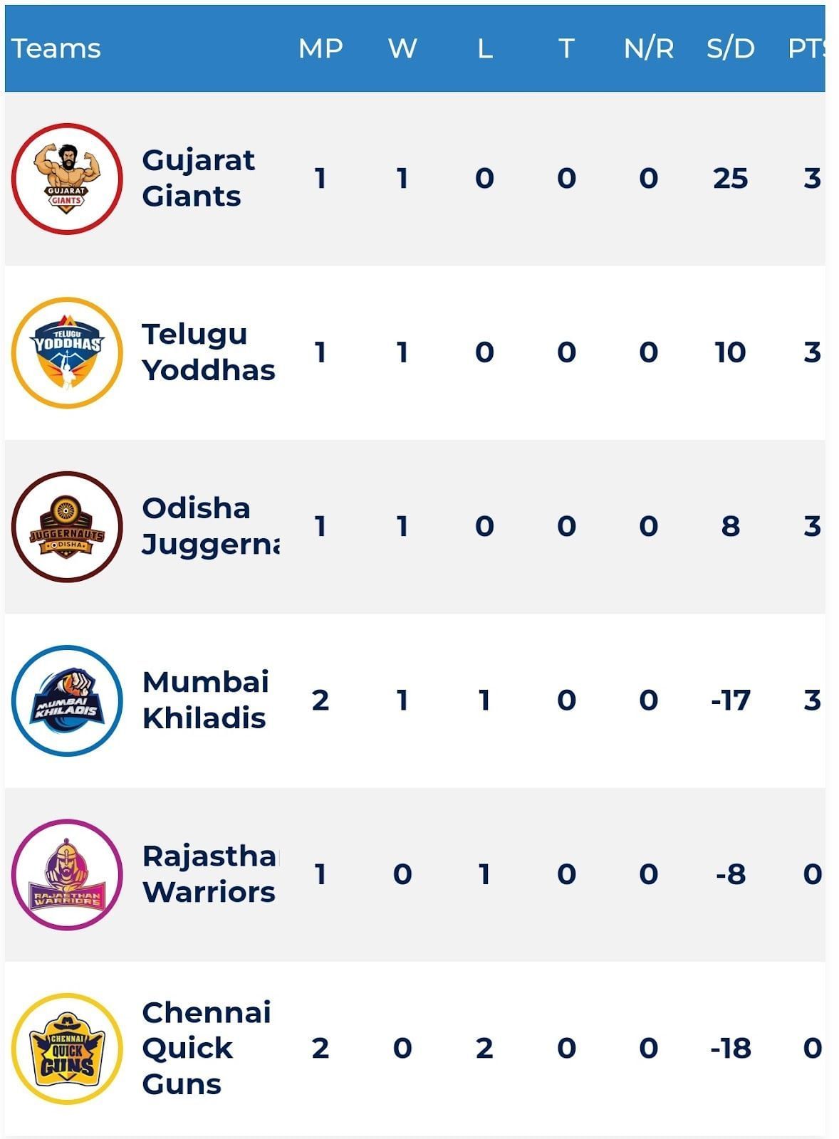 At this stage, all six teams have played at least one match and the Quick Guns are at the bottom of the table while Gujarat Giants lead the table. Telugu Yoddhas and Odisha Juggernauts find themselves in the second and third spots, respectively.