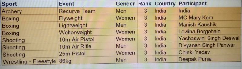 The model also projects bronze medals for boxers MC Mary Kom, Manish Kaushik and Lovlina Borgohain, shooters Yashaswini Singh Deswal, Divyansh Singh Panwar, and Chinki Yadav, wrestler Deepak Punia, and the Indian Recurve Men's Team in Archery.