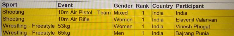 Freestyle wrestlers Vinesh Phogat and Bajrang Punia, shooter Elavenil Valarivan, and the Indian 10 metre Air Pistol Team (mixed) are in line to win gold medals at the Tokyo Olympics later this year, according to projections from a study by Gracenote Sports.