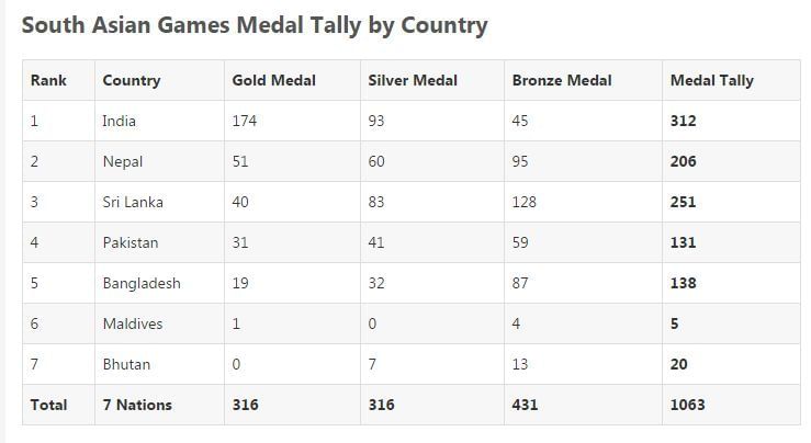 Bangladesh narrowly missed the 20 gold medal landmark while Maldives could only secure a solitary gold medal. Bhutan finished at the bottom of the pile with just 7 silver and 13 bronze medals to show.