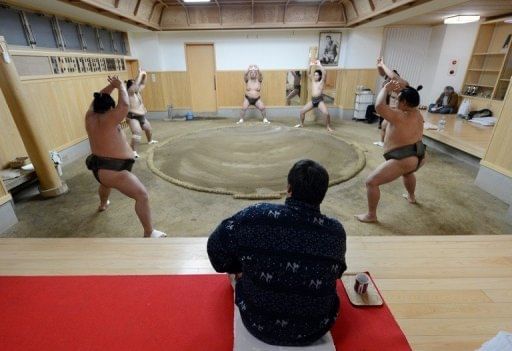 Stablemaster Tadahiro Otake (seated) watches as his sumo wrestlers train at a sumo stable in Tokyo on February 14, 2013. Three hours of exercises, including leg splits and an elaborate foot shuffling routine, culminate in one-on-one clashes in a circular combat ring, a tradition-steeped form of wrestling practiced in Japan for hundreds of years.