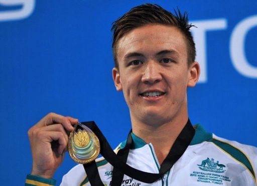 Robert Hurley of Australia smiles on the podium after winning the men’s 50m backstroke final during the FINA World Short Course Swimming Championships in Istanbul.