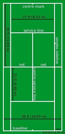The Tennis court is 78 feet (23.77 meters) long. Its width is 27 feet (8.23 meters) for singles matches and 36 feet (10.97 meters) for doubles matches. The service line is 21 feet (6.40 meters) from the net.