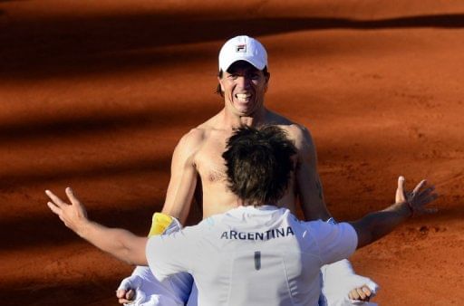 Carlos Berlocq celebrates defeating Gilles Simon on April 7, 2013. Argentina are into the Davis Cup World Group semi-final after Berlocq, the world number 71, beat 13th-ranked Frenchman to hand the South Americans a 3-2 win.