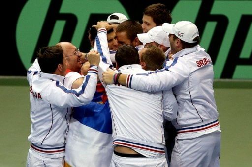 Novak Djokovic is mobbed by his Serbian team-mates on April 7, 2013. Djokovic’s victory over Sam Querrey of the United States advanced Serbia into the Davis Cup World Group semi-finals.