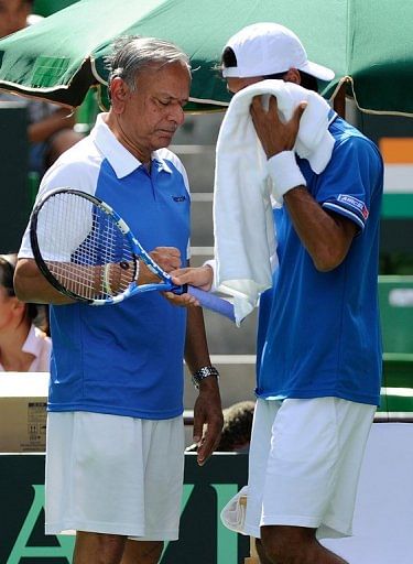 India’s Somdev Devvarman (R) walks past team captain Shiv Misra during a Davis Cup match in Tokyo on September 16, 2011. India’s top tennis players have demanded for Misra and national coach Nandan Bal to be replaced.