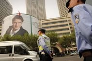 A policeman (C) and security guard stand near a giant poster of Roger Federer in Shanghai on October 5. Security precautions are in place for Federer and his family in the Chinese city, after a unknown blogger made the outlandish threat to “assassinate” the 17-time Grand Slam champion.