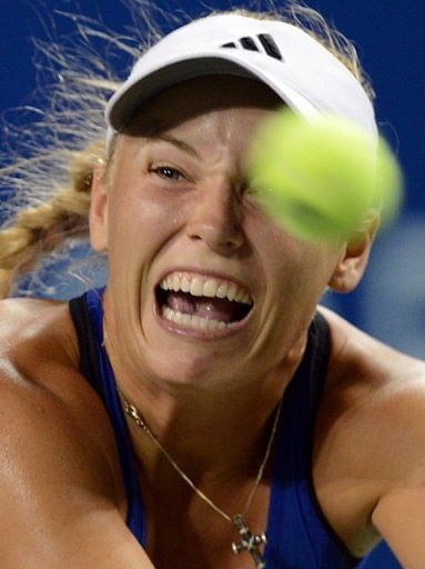 Caroline Wozniacki of Denmark hits a return against Li Na of China during their women’s singles third round match at the Pan Pacific Open tennis tournament in Tokyo on September 26, 2012. Wozniacki won 4-6, 6-3, 6-4.