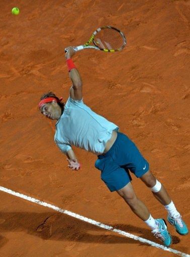 Rafael Nadal of Spain serves to Italian Fabio Fognini during their ATP Rome Open tennis tournament match in the Foro Italico in Rome, on May 15, 2013. Nadal won 6-1, 6-3.