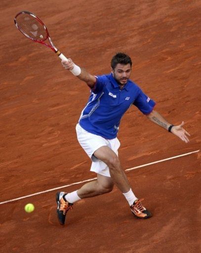 Swiss player Stanislas Wawrinka returns the ball to Czech player Tomas Berdych during their men’s singles semi-final tennis match at the Madrid Masters at the Magic Box (Caja Magica) sports complex in Madrid on May 11, 2013. Wawrinka won 6-3, 4-6, 6-4.