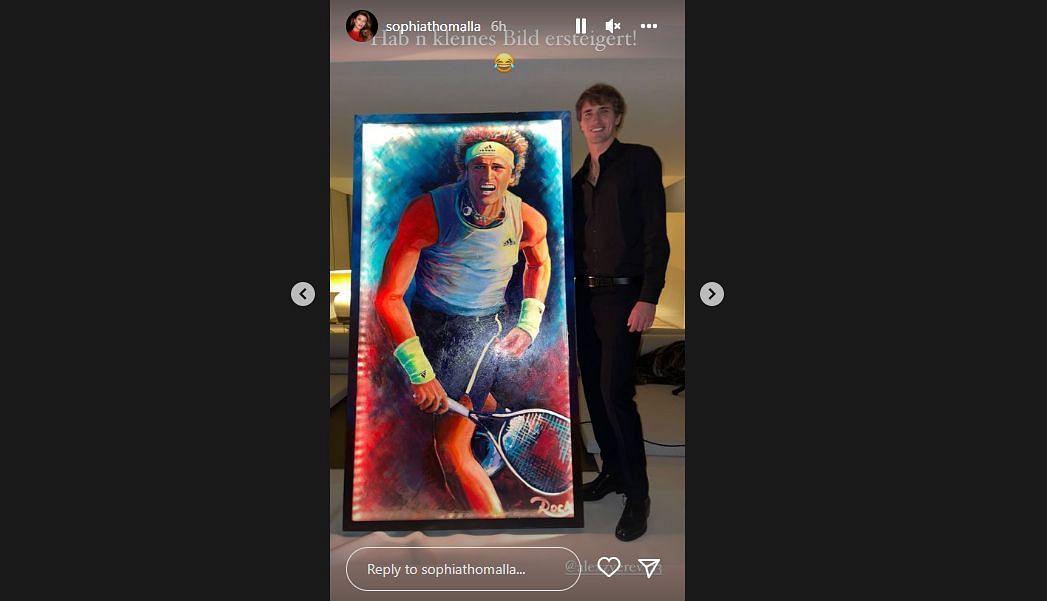 Thomalla took to social media to share a picture of Zverev standing next to his portrait. She joked that she had just auctioned a "small picture."
