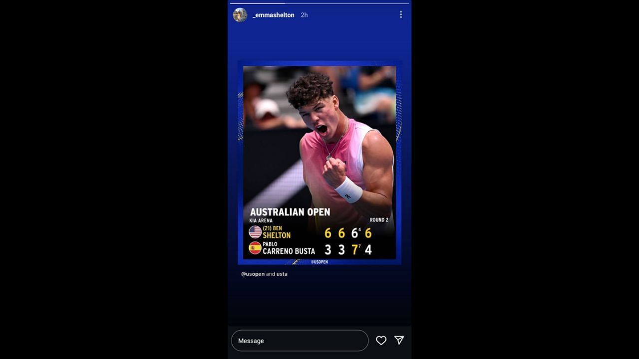Ben Shelton met Pablo Carreno Busta in the second round, and their match stretched to four sets, with the former eventually securing a 6-3, 6-3, 6-7(4), 6-4 victory. Afterwards, his sister Emma took to her Instagram Stories to acknowledge his win.