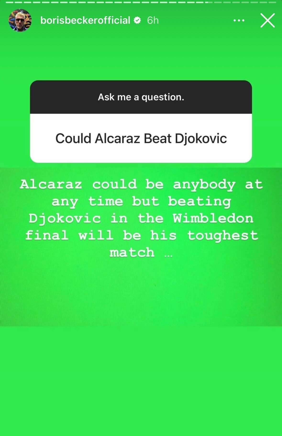 "Alcaraz could beat anybody at any time but beating Djokovic in the Wimbledon final will be his toughest match," Becker wrote on Instagram.