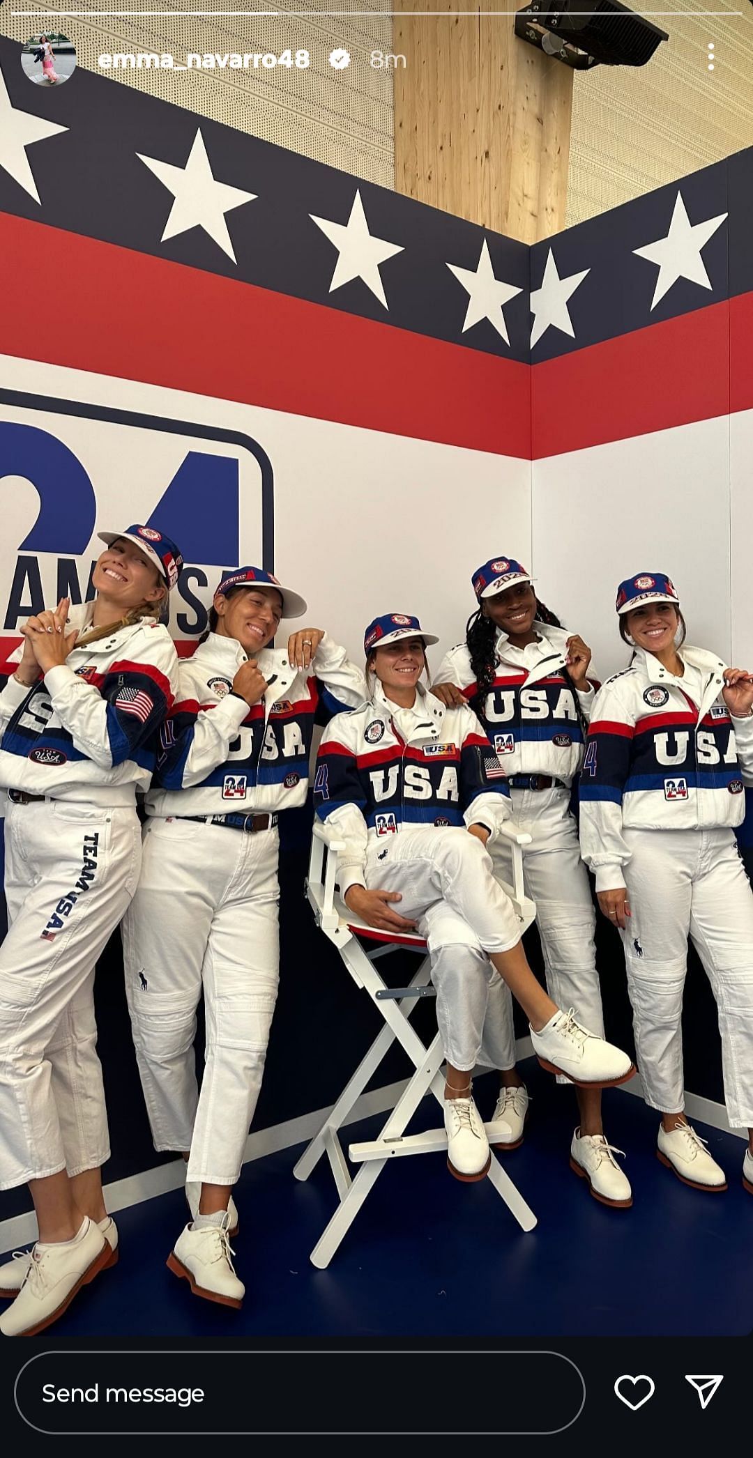 On Tuesday, Emma Navarro shared a photo on her Instagram story featuring herself, Coco Gauff, Jessica Pegula, Danielle Collins, and Desirae Krawczyk. All smiles, the tennis stars stood together, wearing matching outfits that displayed American colors ahead of the 2024 Paris Olympics. They were dressed in white jackets with the word "USA" emblazoned on them and white cargo pants. They completed the look by wearing white Brooks shoes.