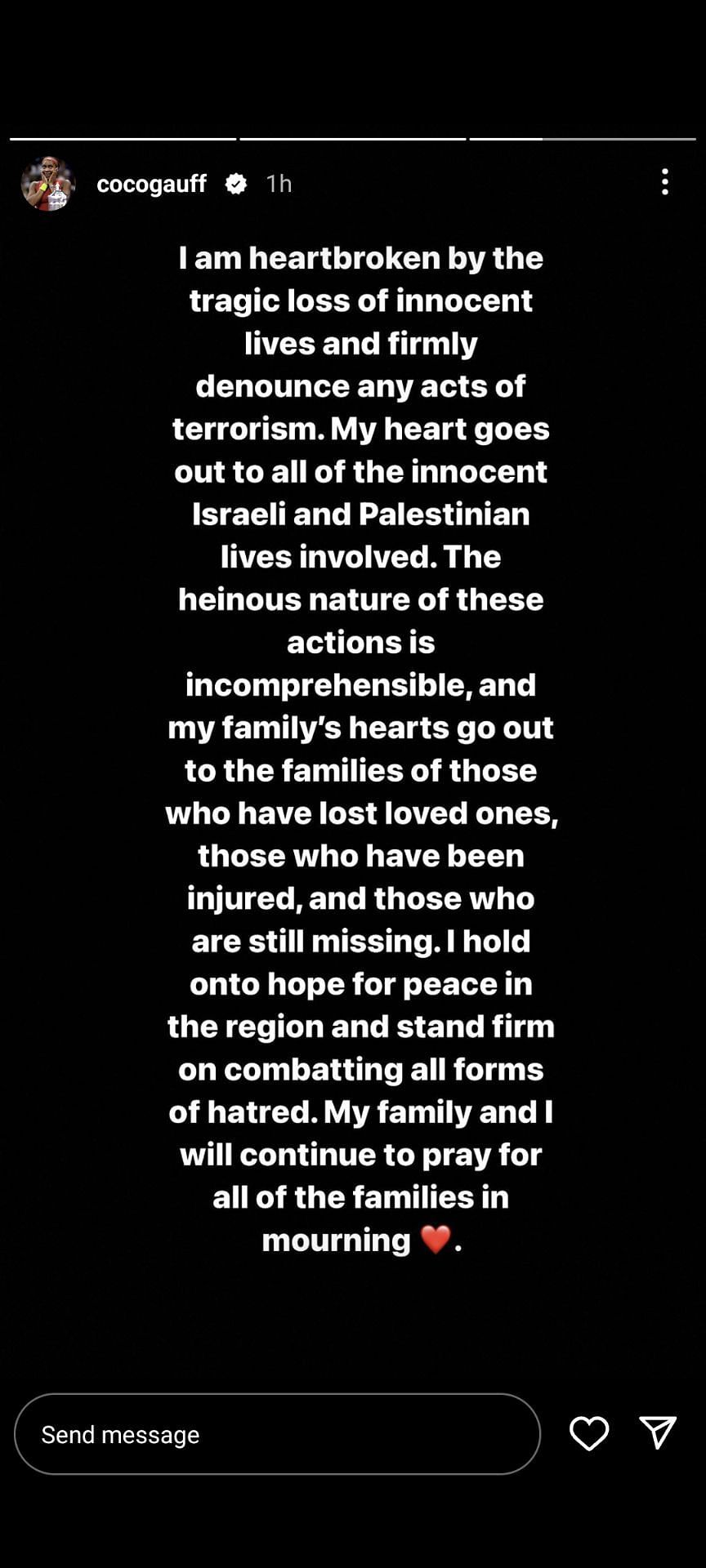 American No. 1 Gauff took to social media to express her sadness at the events in the Middle East and condemned all acts of terrorism. She also said that she remains hopeful that the region will find peace in the future.