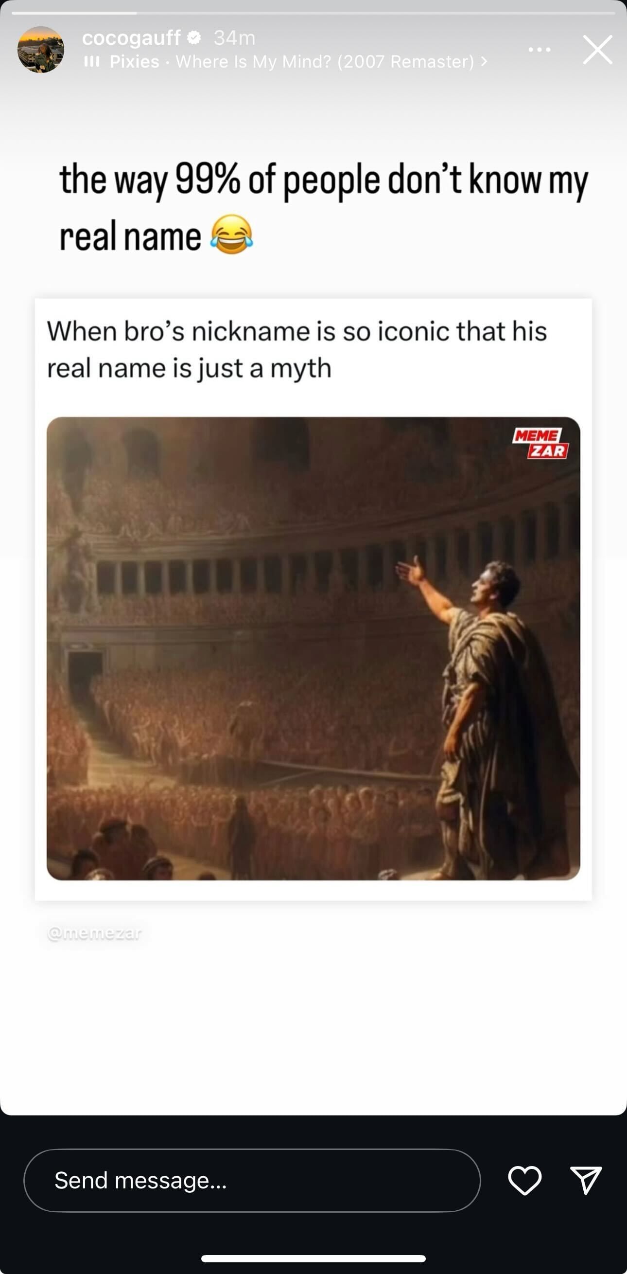 Gauff took to Instagram to share a meme with the same tagline that showed the Colosseum in ancient Rome with the games about to begin. The image was focused on a man stretching an arm out, apparently announcing the entry of a gladiator in dramatic fashion.