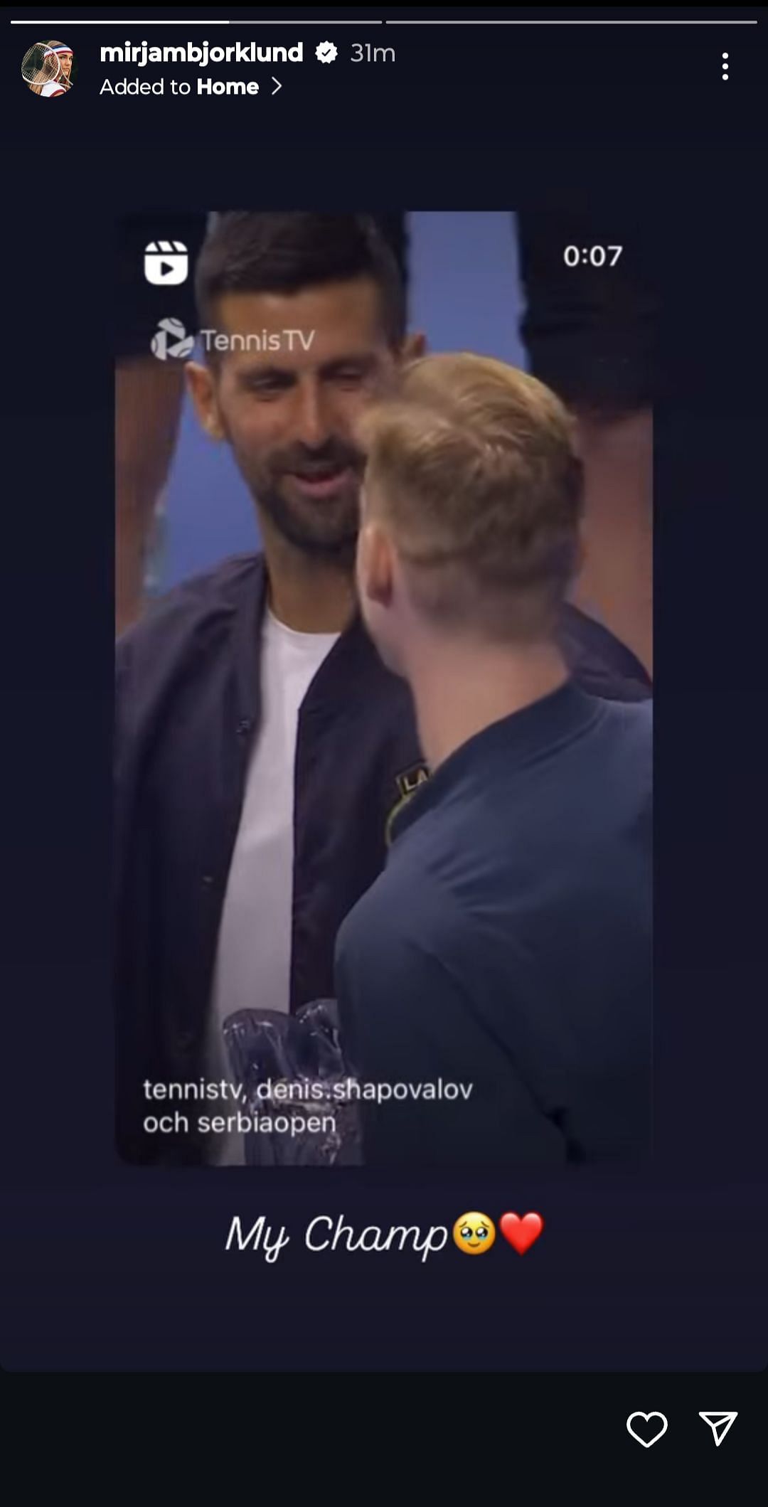 Shapovalov's fiance Mirjam Bjorklund took to Instagram to send him a heartwarming message on his Belgrade Open triumph. She shared a video of Djokovic presenting the trophy to the World No. 78, and her caption read: