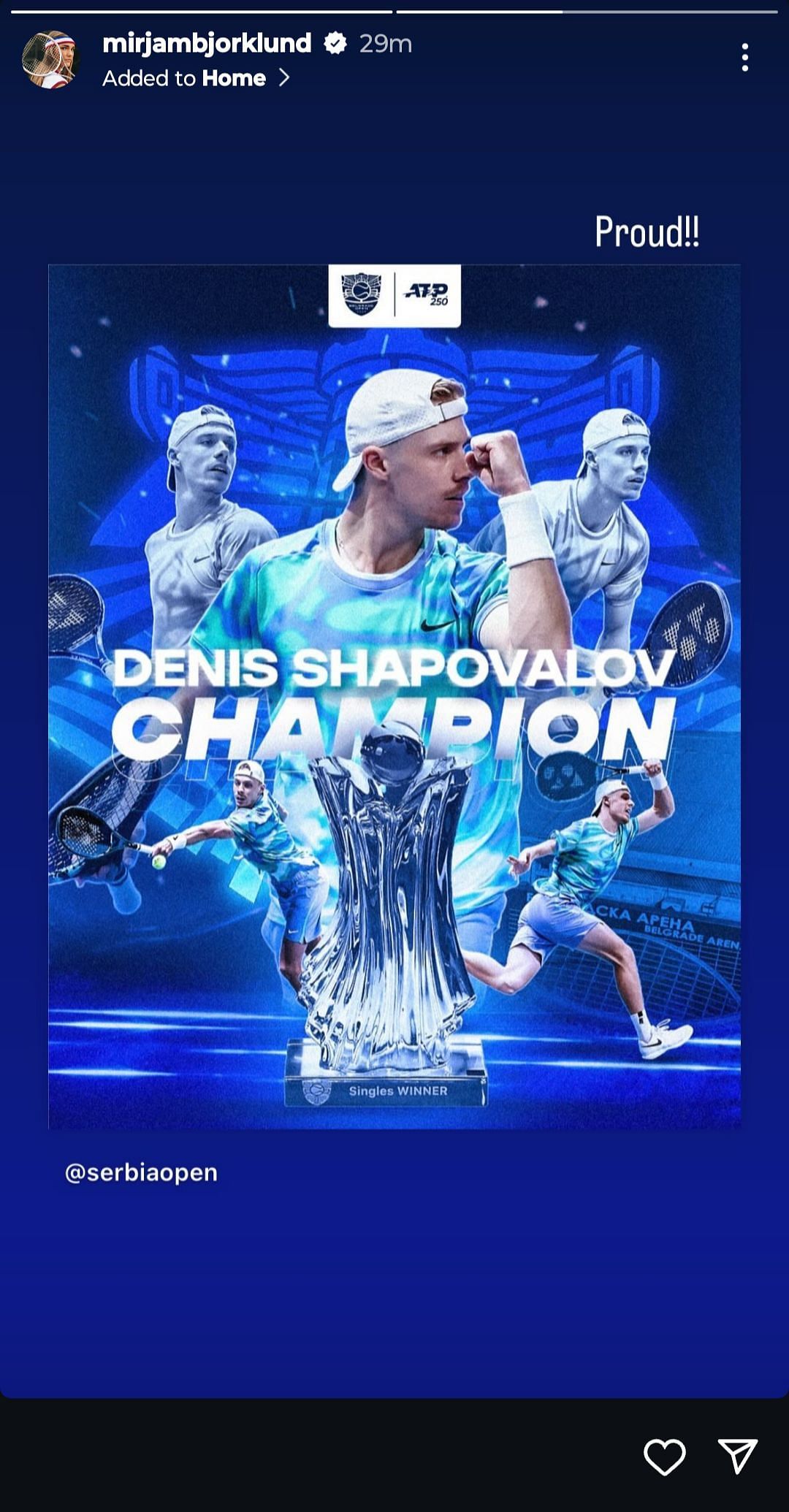 Denis Shapovalov's fiance Mirjam Bjorklund lauded the Canadian on his triumph at the Belgrade Open. The 25-year-old won the ATP 250 title in the Serbian Open, which was his first singles trophy in five years.