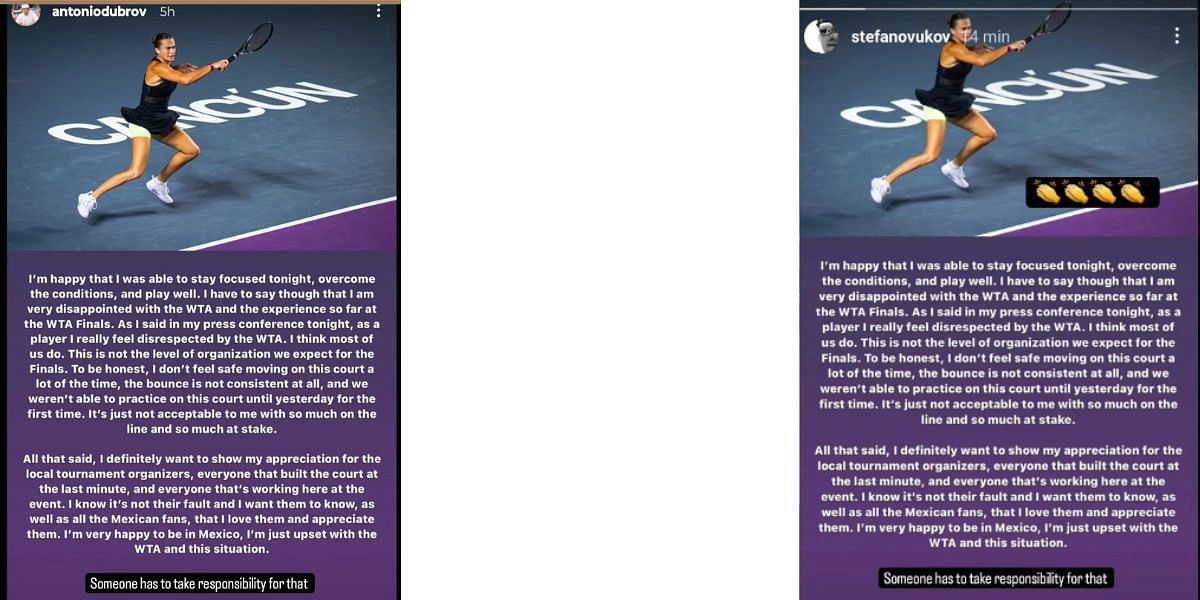 Sabalenka, who is playing in her third consecutive WTA Finals, was particularly vocal about her displeasure with the WTA and the experience so far. She posted a lengthy statement on her Instagram stories after winning her opening match against Maria Sakkari in straight sets, saying that she felt "disrespected" by the WTA and that she did not feel "safe" moving on the court.