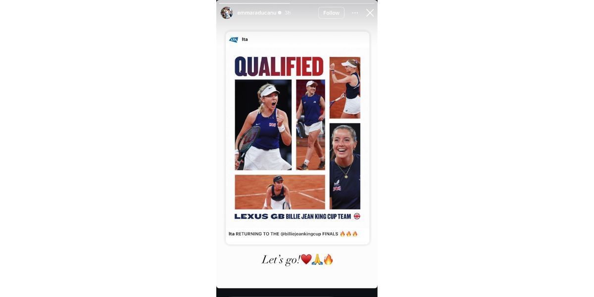 Despite not participating in the event herself, Emma Raducanu appears to have been following Great Britain's progress. After the team sealed their spot in the Billie Jean King Cup Finals, the 22-year-old shared an encouraging message for her compatriots on Instagram.