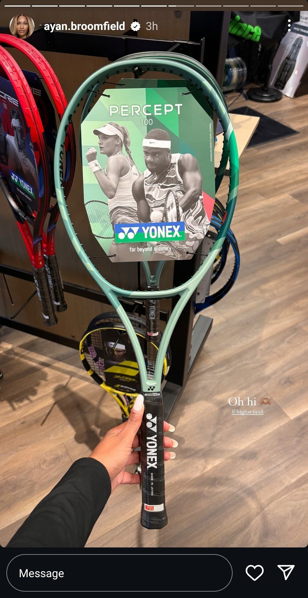 In a later post, Ayan Broomfield flaunted a brand new Yonex Percept 100 racket, which was on sale at the Miami store. The racket's branding featured an intense image of Frances Tiafoe striking his two-handed backhand. Alongside Tiafoe's picture, Yonex-sponsored WTA star Dayana Yastremska's image also featured prominently. Broomfield captioned this post with a wholesome message for her boyfriend, writing: